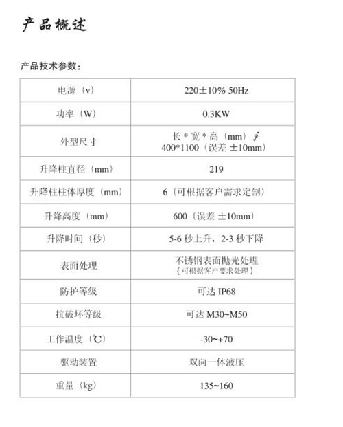 全自動升降柱主要由全自動升降柱體、氣缸、導向軸、封蓋、外箱、鎖等部分組成。升降體:采用304國標不銹鋼8mm/6mm厚鋼管加工形成,具有高強度的承重和抗撞能力;柱體內無電器、線路設置,防水、安全。