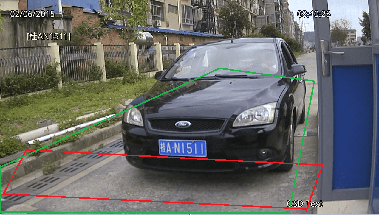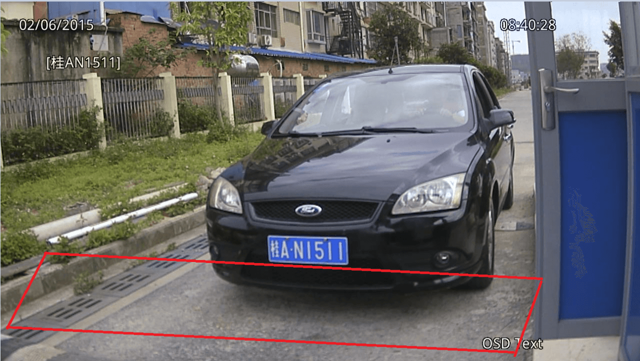 識(shí)別區(qū)域要把車(chē)牌在畫(huà)面上的有效運(yùn)動(dòng)范圍都包含進(jìn)來(lái). 注意:所有現(xiàn)場(chǎng)都必須畫(huà)上識(shí)別區(qū)域! 如圖: