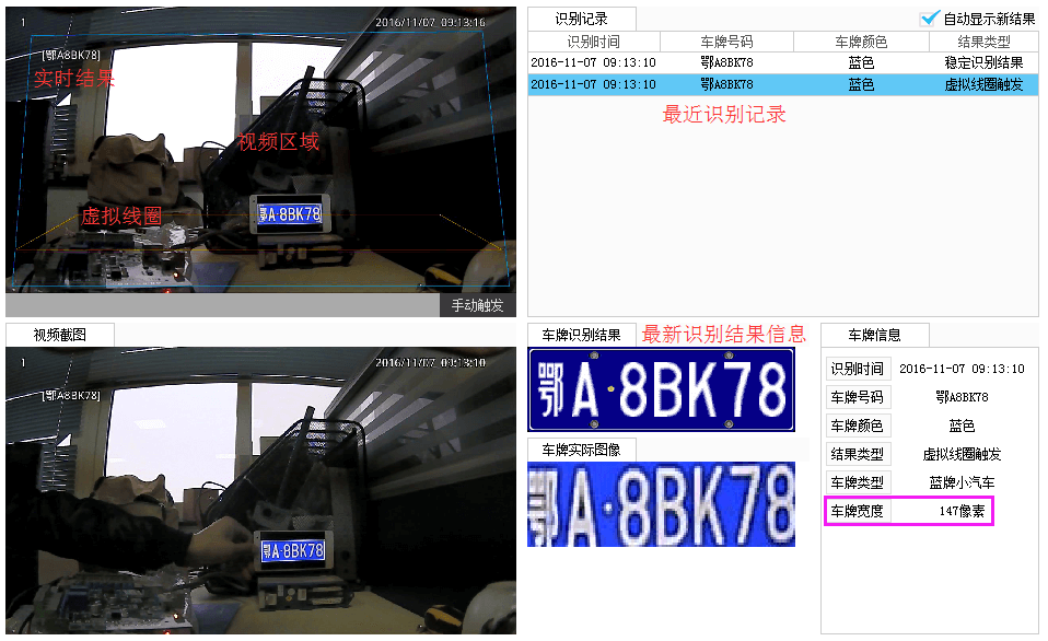 注意觀察虛擬線圈觸發(fā)的識(shí)別結(jié)果,車(chē)牌寬度值是否介于140-160之間.