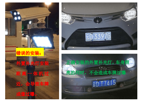 外置補(bǔ)光燈推薦采用白色LED補(bǔ)光燈,20~30W,聚光性質(zhì). 安裝高度要和攝像機(jī)保持在0.5米~0.7米的距離,外置補(bǔ)光燈的亮斑直接打在車(chē)牌或者車(chē)牌偏下一點(diǎn),可以根據(jù)車(chē)牌過(guò)曝情況做微調(diào),比如攝像機(jī)離地面高度1.6米,補(bǔ)光燈裝在同一根立柱0.9米~1.1米高; 注意:特別需要避免與以下外置補(bǔ)光燈錯(cuò)誤的安裝情形: 外置補(bǔ)光燈與攝像機(jī)的安裝距離過(guò)近,如下圖,兩者的安裝距離小于30cm,補(bǔ)光燈的光線會(huì)直接被車(chē)牌表面的反光涂層反射到鏡頭,導(dǎo)致車(chē)牌在視頻圖像中過(guò)曝,顯得發(fā)白,影響 終的識(shí)別效果.